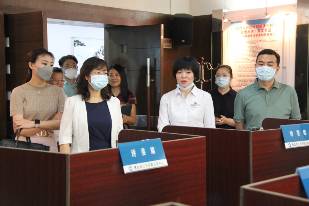 杨洁司长一行在佛山市政府副市长陈小坚、省发展改革委体改处处长周锦林、佛山市政务服务数据管理局局长陈伟锋等领导陪同下,实地参观了佛山市交易中心的办公区域、远程评标室、监控室等交易服务场所。