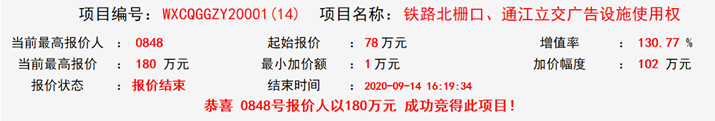 9月14日,无锡市2020年首批户外广告设施设置空间使用权在无锡市公共资源交易中心产权交易分中心(无锡产权交易所),通过“不见面”网络竞价方式,实现顺利出让,标志着无锡市户外广告设施设置空间使用权正式整合纳入无锡市公共资源交易平台交易。