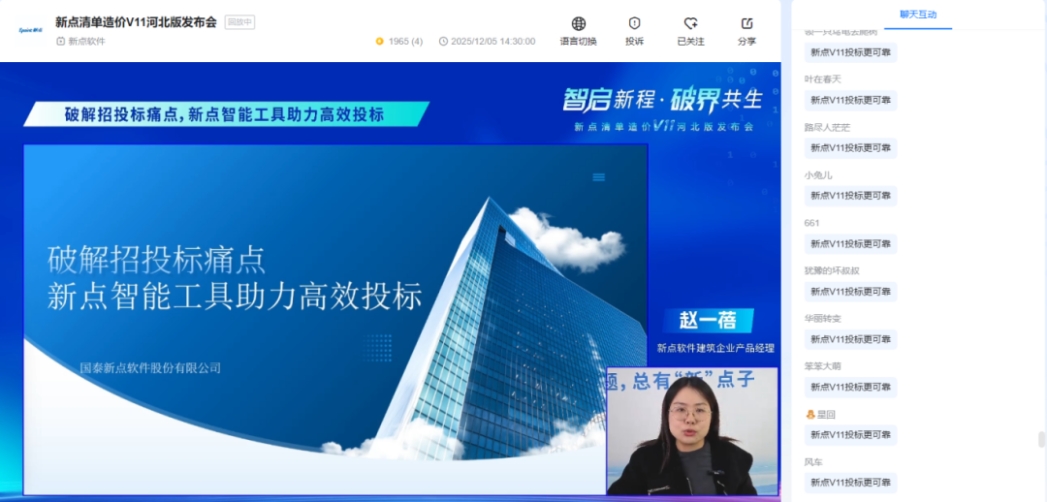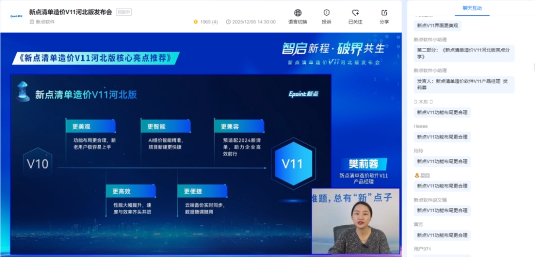 在本次发布会上,新点清单造价软件V11产品经理樊莉蓉立足河北本土化应用场景,通过全流程功能演示,系统性阐释了V11的五大核心升级维度。新点软件始终聚焦功能创新与行业痛点破解,致力于为河北造价领域提供更专业、更可靠、更契合本地化需求的解决方案。