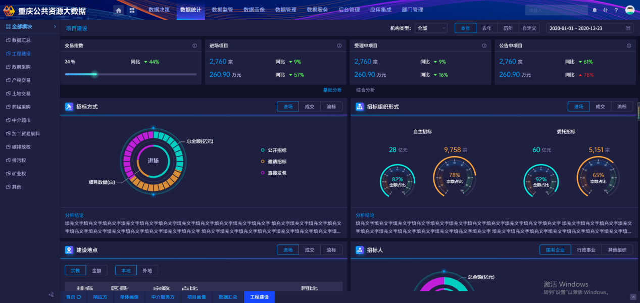 该系统将大数据技术与公共资源交易深度融合,系统适用性、针对性、可扩展性和数据处理能力、智能分析能力全面提升。分析业务涵盖工程招投标、政府采购、土地和矿业权出让、国有资产交易、药品器械交易、环境权交易等所有交易品类,系统用户扩展至全市公共资源交易中心、监督部门和市场主体,具有语义识别、智能分析、智能预警、智能报表、智能报告及订制服务等功能,形成从数据标准、数据采集、数据治理、数据分析、数据共享到数据服务的全链条大数据分析应用体系。