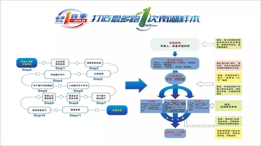 2018年底,全国率先实现常态化企业开办一日办结,实现准入即准营,开办时间比世界银行2019年营商环境报告评估的国内水平提速93%以上。将工商登记、公章刻制、银行开户、领取发票4个环节统一为1个完整的闭环流程,企业开办只需7份材料,实现1个工作日办结。2019年,继续延伸企业开办“一件事”业务链,全国率先打通公积金开户环节,为常态化企业开办“家族”纳入新成员。