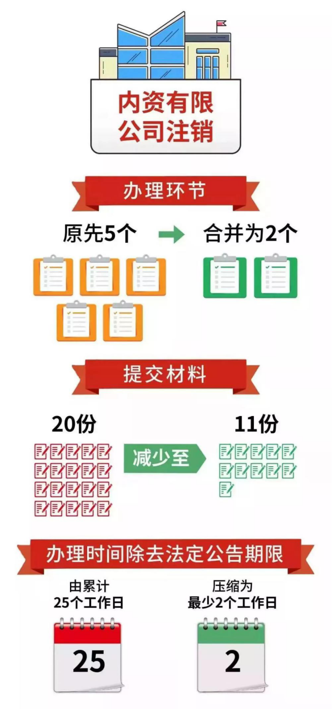 将企业注销“一件事”作为企业全生命周期重要一环,率先通过“一口咨询”线上标准智能指南、“一键诊断”线上线下定制方案、“一窗通办”再造流程集成服务、“一链追踪”信用联惩全程监管,推进企业注销便利化,促进市场“新陈代谢”。以最常见的内资有限公司为例,注销办理环节由5个合并为2个,提交办事材料由20份减少至11份,办事时间由25个工作日压缩至2个工作日以内(不含公告期)。