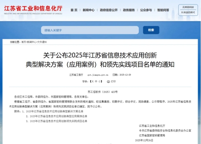 2025年12月26日,江苏省工业和信息化厅、中共江苏省委网络安全和信息化委员会办公室、江苏省国家密码管理局联合发布“2025年江苏省信息技术应用创新典型解决方案(应用案例)和领先实践项目名单”。凭借创新的技术实力与扎实的业务支撑,新点软件推出的“新点工程建设项目全生命周期数字化管理平台解决方案”“新点e交易平台解决方案”“新点软件基于人工智能大模型技术的政务智能体解决方案”成功入选典型解决方案名单,再添三项荣誉。